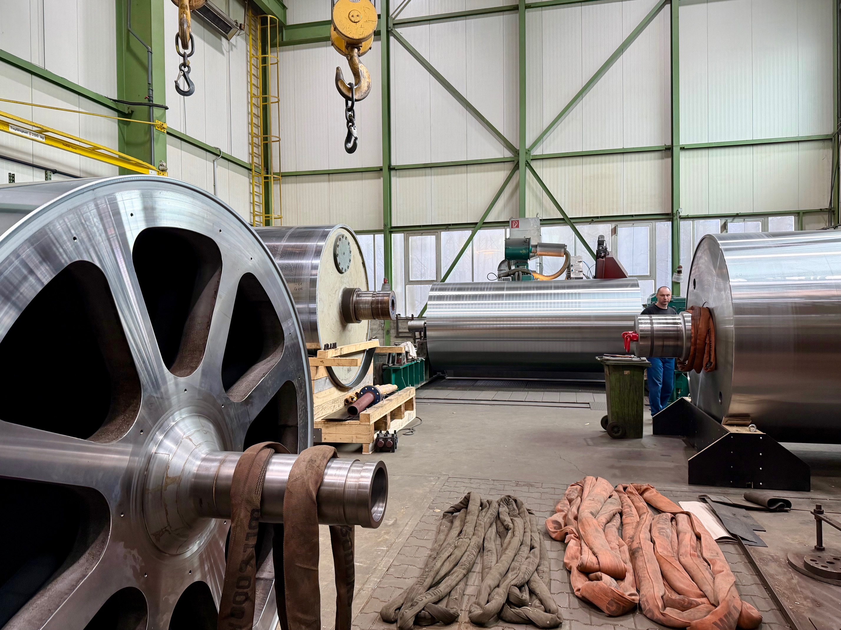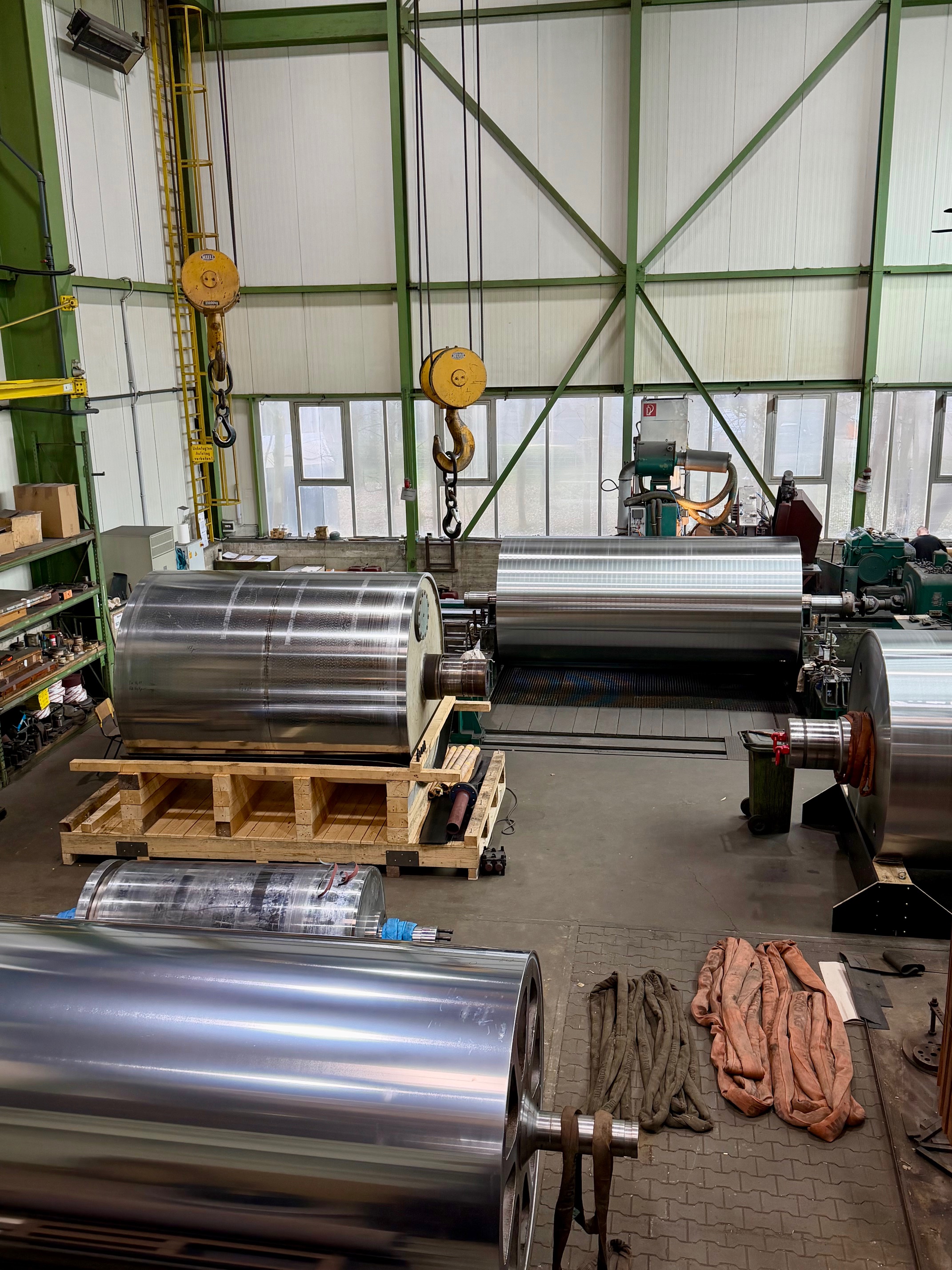 Wir freuen uns über ein spannendes Projekt in unserer Fertigung: Aktuell bearbeiten wir zwei Walzen mit einer beeindruckenden Ballenlänge von 13.000 mm (Gesamtlänge inklusive Zapfen: 14.400 mm) und Durchmessern von 770 mm bzw. 900 mm.